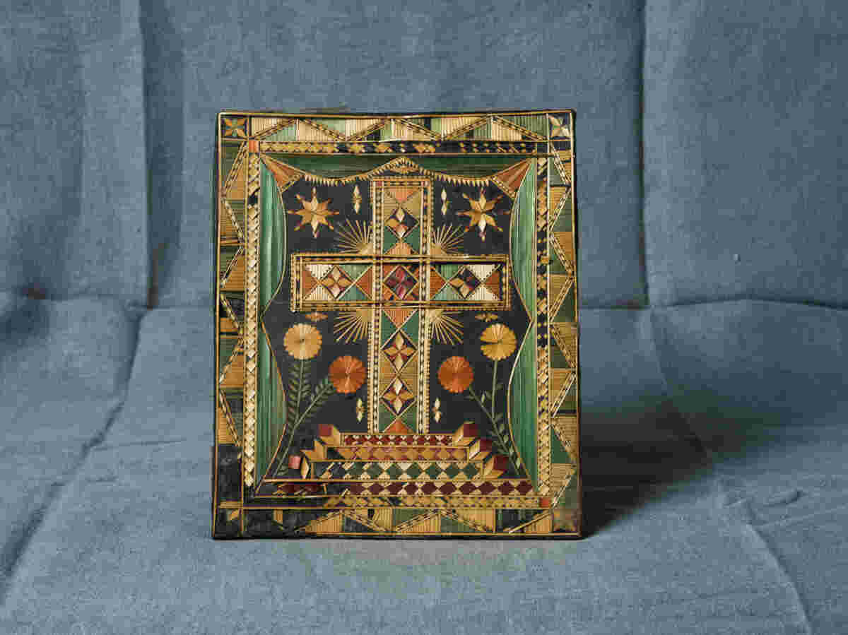 This colorful icon was decorated and adorned with matchstick designs by an inmate at the Prison of Rhodes.
